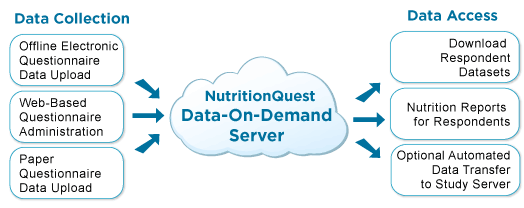 NutritionQuest's Data-on-Demand is a turn-key system, which provides an online structure for integrated data collection, nutrient and physical activity analysis, and data management. Questionnaires can be administered, the data stored, and nutrition or physical activity estimates calculated. And you have instant, secure, 24-7 access to all the data as the study proceeds.